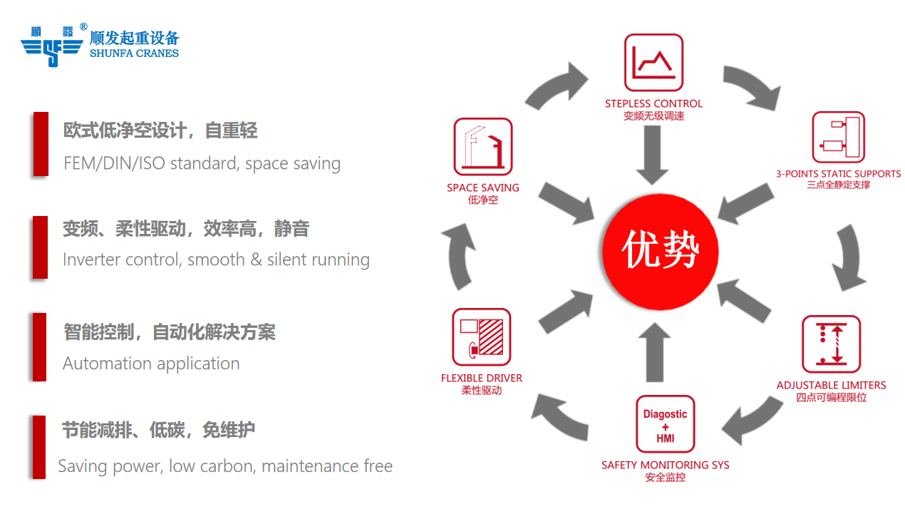 歐式雙梁橋式起重機(jī)是基于歐洲輕量化和模塊化設(shè)計(jì)理念以及先進(jìn)生產(chǎn)制造工藝,在橋架上設(shè)置一臺(tái)小車(chē)及起升機(jī)構(gòu),小車(chē)可以前后運(yùn)行,大車(chē)運(yùn)行等機(jī)構(gòu),實(shí)現(xiàn)物料物體在立體空間搬運(yùn),使整個(gè)起重機(jī)的結(jié)構(gòu)緊湊,運(yùn)行平穩(wěn),自重減輕,高度降低,節(jié)能減耗,大大減少用戶對(duì)起重機(jī)運(yùn)行廠房的建造成本和起重機(jī)運(yùn)行費(fèi)用,提高起重機(jī)的整機(jī)品質(zhì)和運(yùn)行性能。