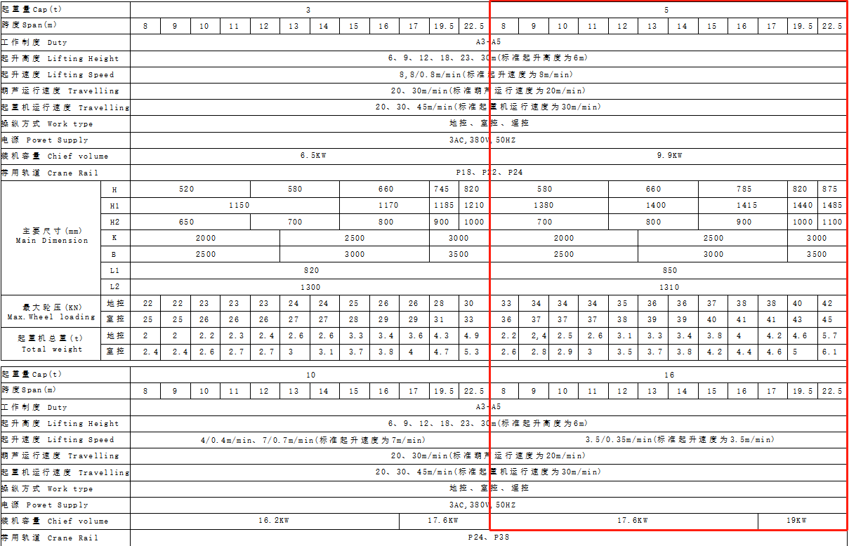 16噸單梁起重機(jī)技術(shù)參數(shù)及配置表