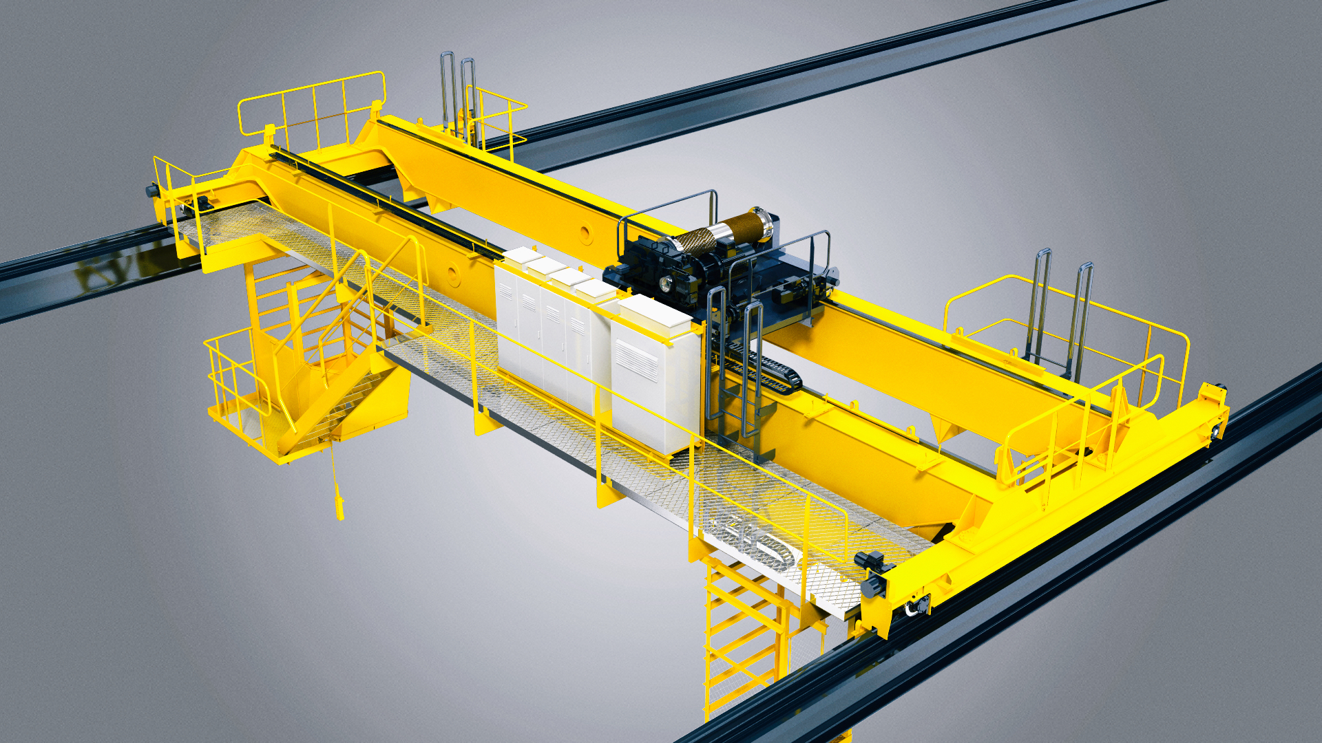 橋架結(jié)構(gòu):歐式起重機(jī)的橋架結(jié)構(gòu)是其最為顯著的特點(diǎn)之一,通常由兩側(cè)立柱和跨越工作區(qū)域的梁組成。這種結(jié)構(gòu)具有橫向行走和縱向起重兩個(gè)運(yùn)動(dòng)方向,可以在工作區(qū)域內(nèi)自由運(yùn)動(dòng),同時(shí)能夠承受較大的載荷。